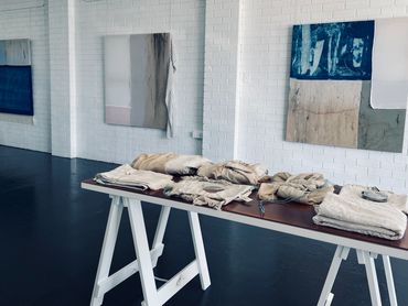 I see these four works as the bridge between painting and sculpture, like a form of ‘Expanded Painting’. They are not just a painting on a wall but an object, you can see through them, smell the vegetation from the site through the natural made dyes and understand that they are not just paintings but an extension of the installation. These works are present within the space and present within the conversations I am having with the viewer.