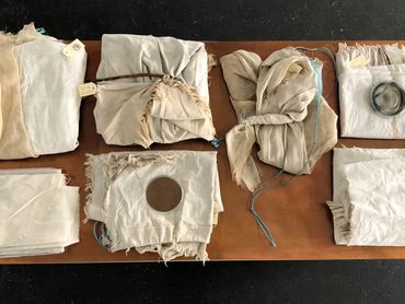 The installation consisted of 12 white linen flags that were hung between these trees with blue nylon string. A sheet of copper was also suspended. The work was placed in situ on the first anniversary of the passing of my father. The flags hung for 12 months while the environment around it shaped the fabric. My plan was to document the work each time I returned home to Mildura. However, the Pandemic changed that, and instead I was lucky enough to quarantine in Mildura. I documented the work, watching it evolve. The beauty of hearing the fabric and copper blowing in the wind, being able to immerse myself within the work, and to document the installation throughout its many different changing surroundings throughout the year made it even more special.